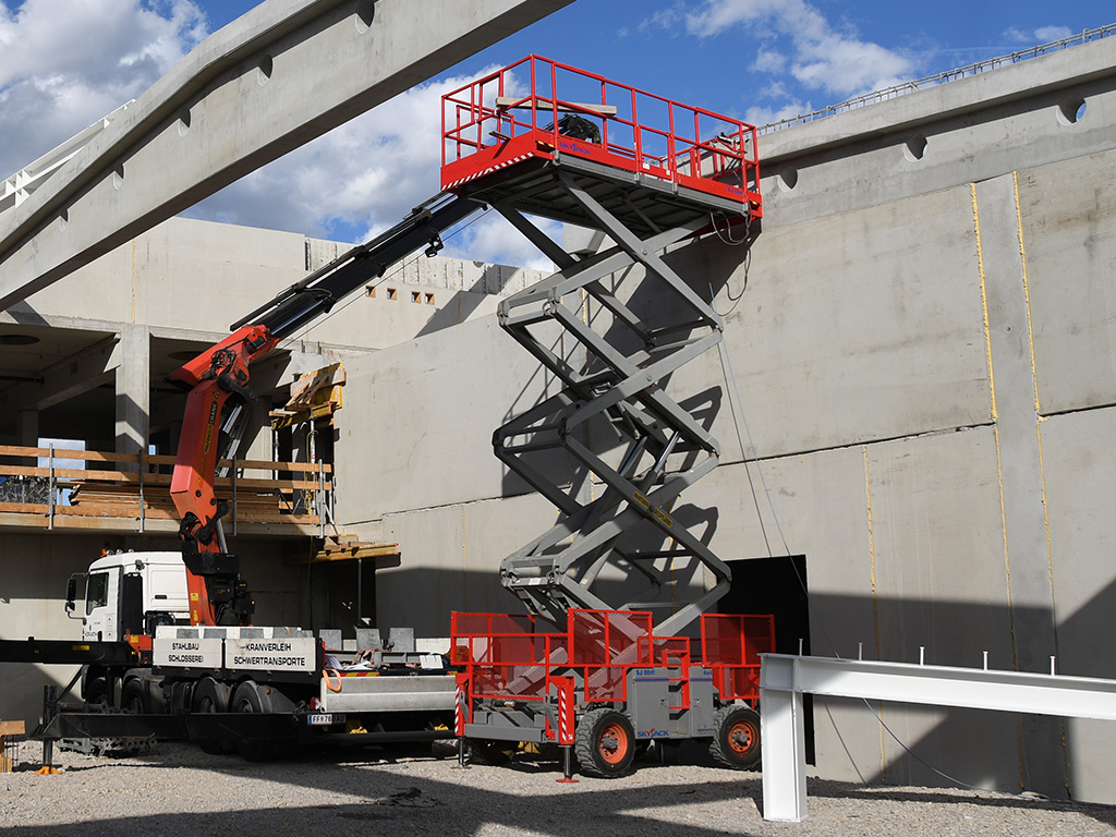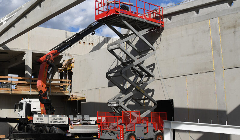 Dieselscherenbühnen eignen sich vor allem zur Aufstellung direkt unter dem Arbeitsplatz oder an flachen Fassaden. Der kraftvolle Dieselantrieb und die Stollenreifen ermöglichen es auch schwer zugängliche Arbeitsbereiche im Gelände zu erreichen. Durch zwei Ausschübe kann die Gesamtlänge der Plattform auf über 5,7 Meter verlängert werden, was z. Bsp. die Montage von langen Fassadenpaneelen ermöglicht. Hiermit lassen sich Personen und Materialien (680 kg) sicher bis auf die gewünschte Höhe befördern. Arbeitsbühnen mit Dieselantrieb sind für (schwere) Außenarbeiten entworfen und eignen sich u. a. dank der stabilen Nivellierungsstützen für unwegsames Gelände.