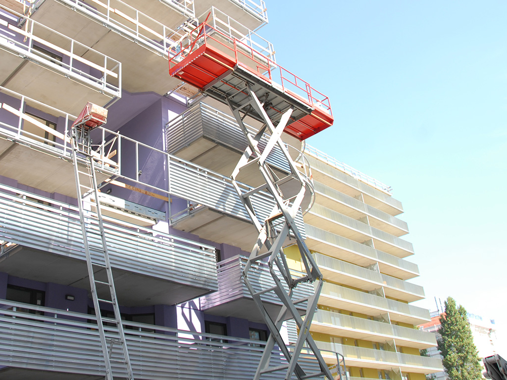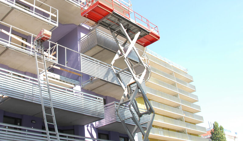 Dieselscherenbühnen eignen sich vor allem zur Aufstellung direkt unter dem Arbeitsplatz oder an flachen Fassaden. Der kraftvolle Dieselantrieb und die Stollenreifen ermöglichen es auch schwer zugängliche Arbeitsbereiche im Gelände zu erreichen. Durch zwei Ausschübe kann die Gesamtlänge der Plattform auf über 7,2 Meter verlängert werden, was z. Bsp. die Montage von langen Fassadenpaneelen ermöglicht. Hiermit lassen sich Personen und Materialien (680 kg) sicher bis auf die gewünschte Höhe befördern. Arbeitsbühnen mit Dieselantrieb sind für (schwere) Außenarbeiten entworfen und eignen sich u. a. dank der stabilen Nivellierungsstützen für unwegsames Gelände.