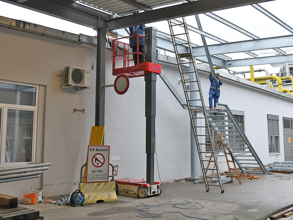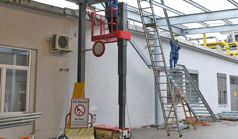 Dieser selbstfahrende Personenaufzug passt durch Standardtüren und in alle gängigen Aufzüge. Die abriebfesten Weißreifen hinterlassen keinerlei Spuren am Boden. Der große Lenkeinschlag ermöglichte es Ihnen punktgenau um engste Kurven zu fahren und am Stand umzudrehen. Auf Grund Ihres geringen Gewichtes kann die Maschine in Gebäuden mit begrenzter Bodenbelastung eingesetzt werden. Er kann trotzdem 2 Personen einschließlich Werkzeug auf eine sichere Arbeitshöhe von gut 5,6 m befördern.