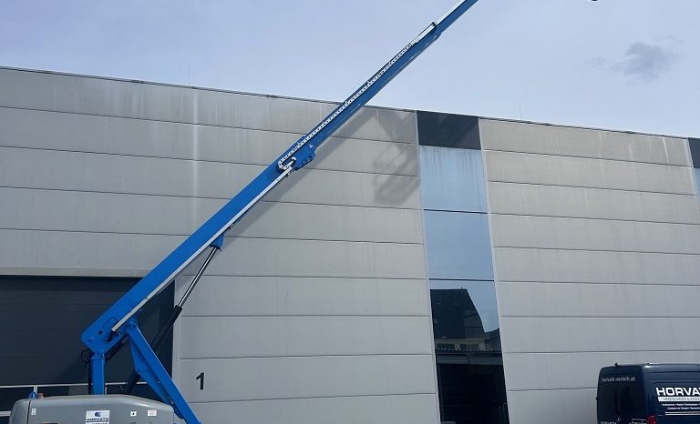 Teleskopbühne für Arbeiten, Reparaturen, Installationen und Wartungen in großer Höhe. Mit der Teleskopbühne HT 218D wird eine Arbeitshöhe von 21,8 Metern und eine seitliche Reichweite von 17,1 Metern erreicht. Selbst 3 Meter unter Nullniveau kann gearbeitet werden. Der kraftvolle 4WD-Dieselantrieb und die Stollenreifen ermöglichen es Ihnen auch schwer zugängliche Arbeitsbereiche im Gelände anfahren zu können. Die Arbeitsbühne ist um 360° drehbar. Außerdem kann mit ihr auch bei vollständiger Höhe und Belastung (230kg) noch gefahren werden.